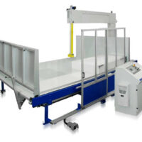 Machine de découpe verticale automatique pour rogner des blocs, découper des plaques et réaliser des coupes rectangulaires dans des matériaux en plaques